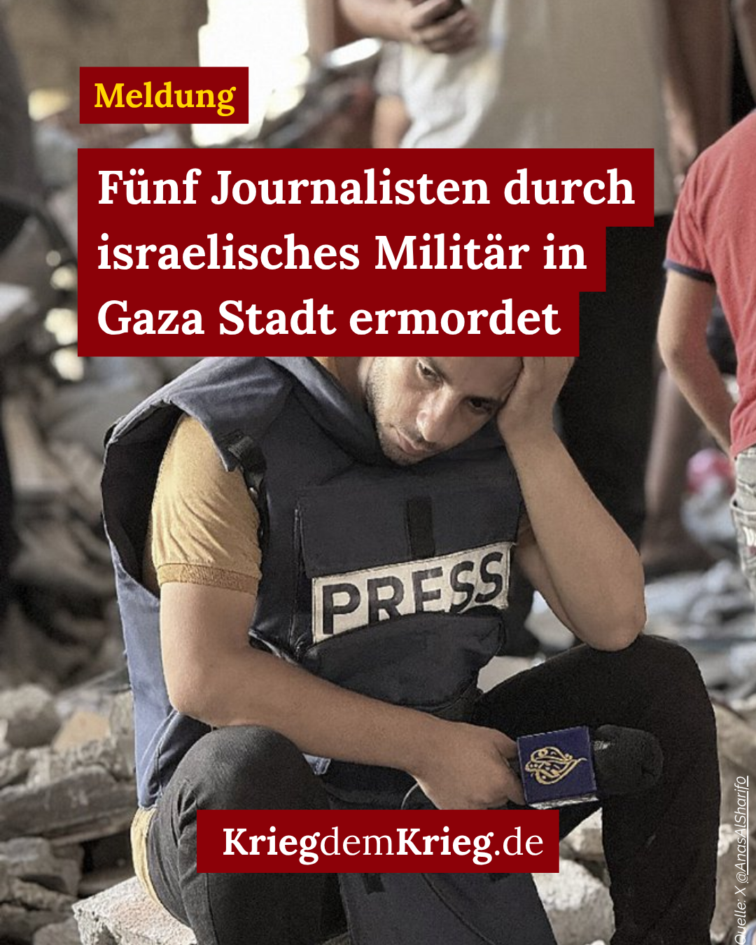 Quellen: https://cpj.org/2025/08/israel-kills-al-jazeera-journalists-in-targeted-gaza-city-airstrike/ https://www.aljazeera.com/news/2025/8/10/al-jazeera-journalist-anas-al-sharif-killed-in-israeli-attack-in-gaza-city